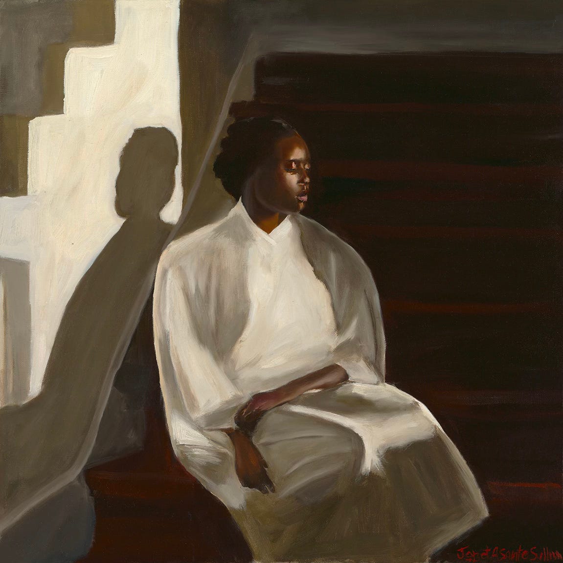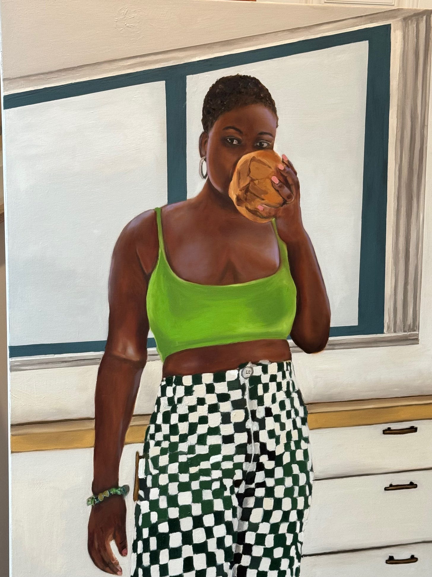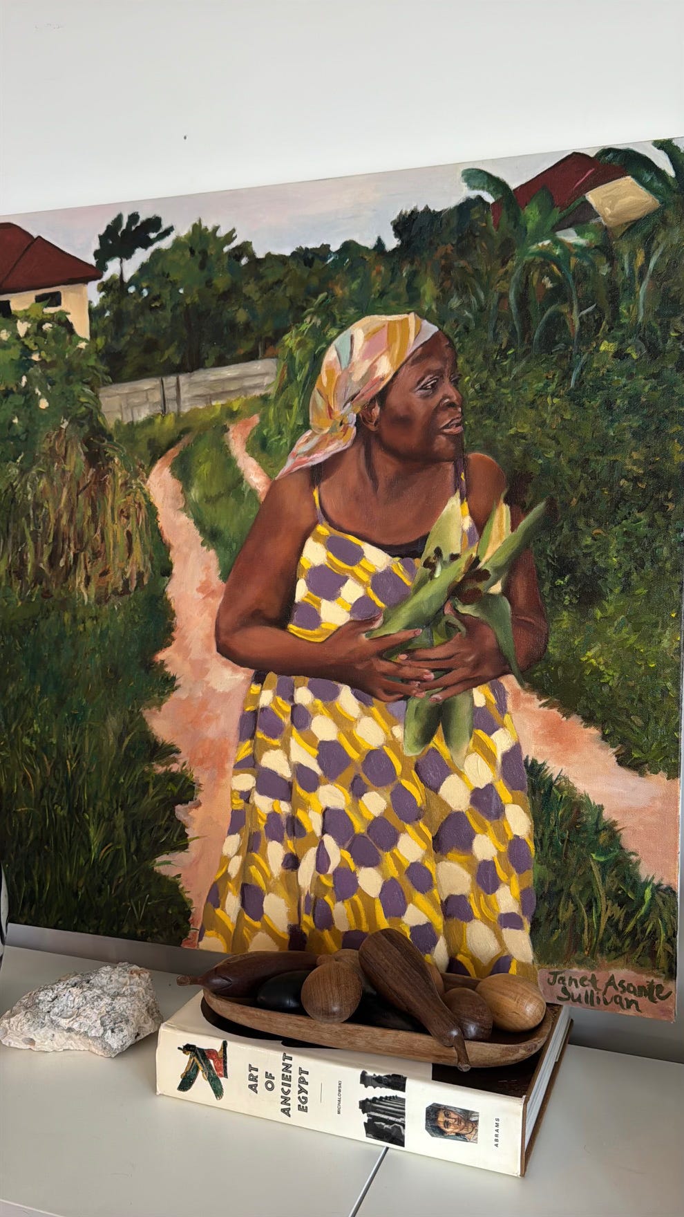 I’ve been working on a self-portrait of me in my mom’s kitchen in Ghana, drinking a coconut she had just cracked open for me on a hot day. It’s meant to pair with the piece above of my mom collecting corn outside while I sit comfortably in her kitchen enjoying the fruits of her labor.