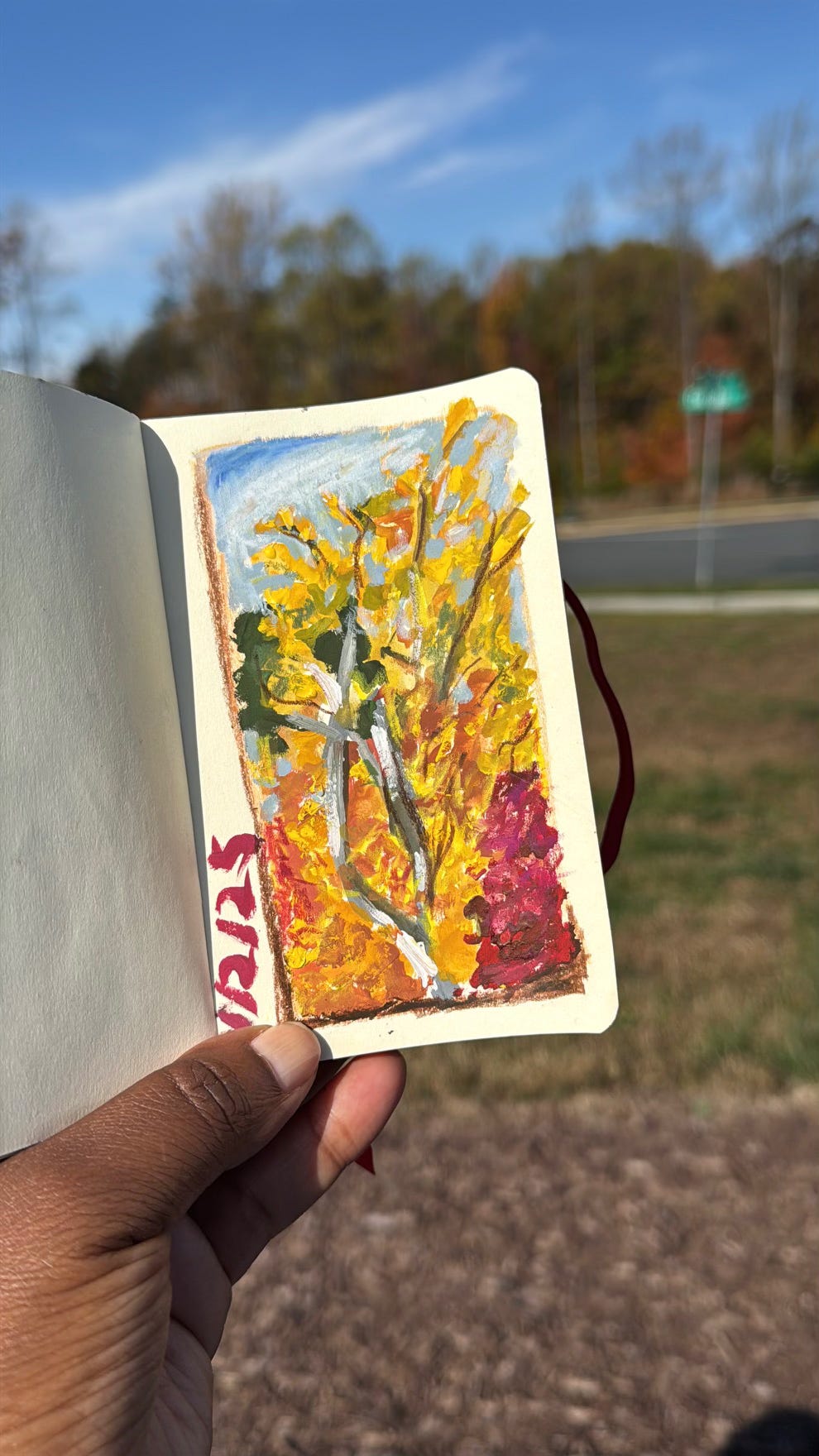 I paired sketching with my morning walk with our dog. I tuck a small sketchbook and a few Neocolors or a tiny case of gouache in my jacket pocket, then sit on the same bench each morning for a few minutes to capture the turning fall leaves before heading home. I usually spend no more than ten minutes, but those brief moments give me a sense of calm. I always walk back home feeling more grounded.